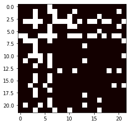 In the set of 22 x 22 combinations of two statements how many lead to puzzles with unique solutions? It turns out that only 90 puzzles emerge - the graph below shows white squares for all combinations that lead to valid puzzles, black squares for those that do not. It doesn't matter which inhabitant is making a particular statement, leading to the symmetry in the graph and duplication in the puzzles (if you don't care about statement order).